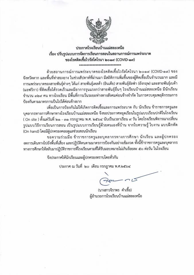 ประกาศโรงเรียนบ้านแม่สละเหนือ เรื่อง ปรับรูปแบบการจัดการเรียนการสอนในสถานการณ์แพร่ระบาดของโรคติดเชื้อไวรัสโคโรน่า 2019 (COVID-19) โดยทางโรงเรียนจะจัดการเรียนการสอนแบบให้นักเรียนทำใบงาน และเรียนรู้ด้วยตัวเองที่บ้าน (On hand) ในระหว่างวันที่ 21 - 31 กรกฎาคม 2564 เนื่องจากเป็นการเฝ้าระวังและป้องกันการแพร่ระบาดของโรคติดเชื้อไวรัสโคโรนา 2019