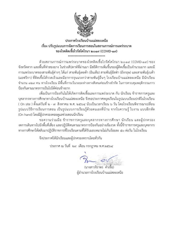 ประกาศโรงเรียนบ้านแม่สละเหนือ เรื่อง ปรับรูปแบบการจัดการเรียนการสอนในสถานการณ์แพร่ระบาดของโรคติดเชื้อไวรัสโคโรน่า 2019 (COVID-19) เนื่องจากสถานการณ์ยังไม่ดีขึ้น ทางโรงเรียนจึงขอประกาศจัดการเรียนการสอนแบบให้นักเรียนทำใบงาน และเรียนรู้ด้วยตัวเองที่บ้าน (On hand) ในระหว่างวันที่ 2-7 สิงหาคม 2564