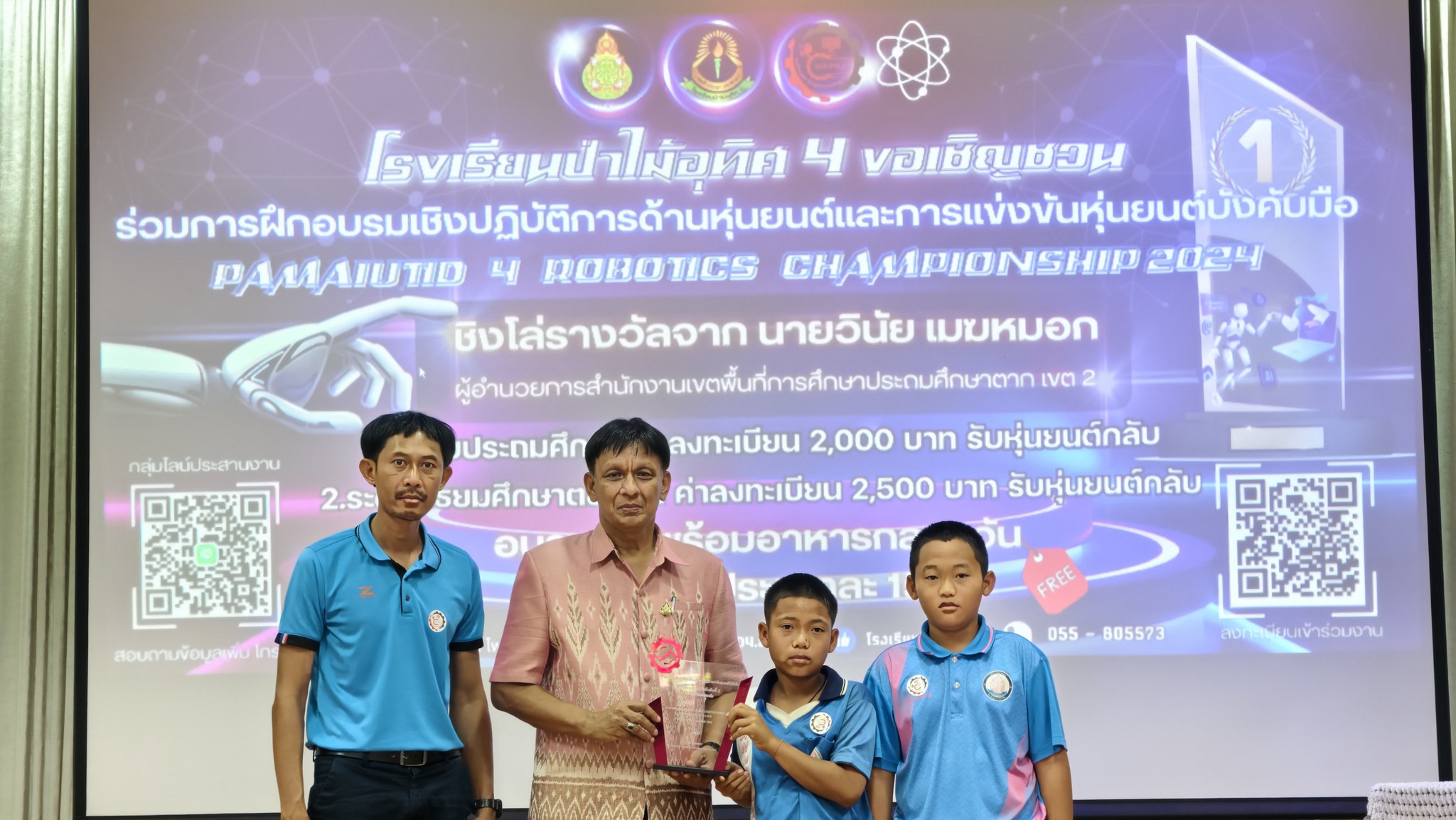 รายการแข่งขันหุ่นยนต์บังคับมือ ลำเลียง LOGISTICS ROBOT ระดับประถมศึกษา ได้รับรางวัลรองชนะเลิศอันดับที่ 2 ระดับเหรียญทอง รับโล่รางวัลพร้อมเกียรติบัตรจาก นายวินัย เมฆหมอก ผู้อำนวยการสำนักงานเขตพื้นที่การศึกษาประถมศึกษาตาก เขต 2